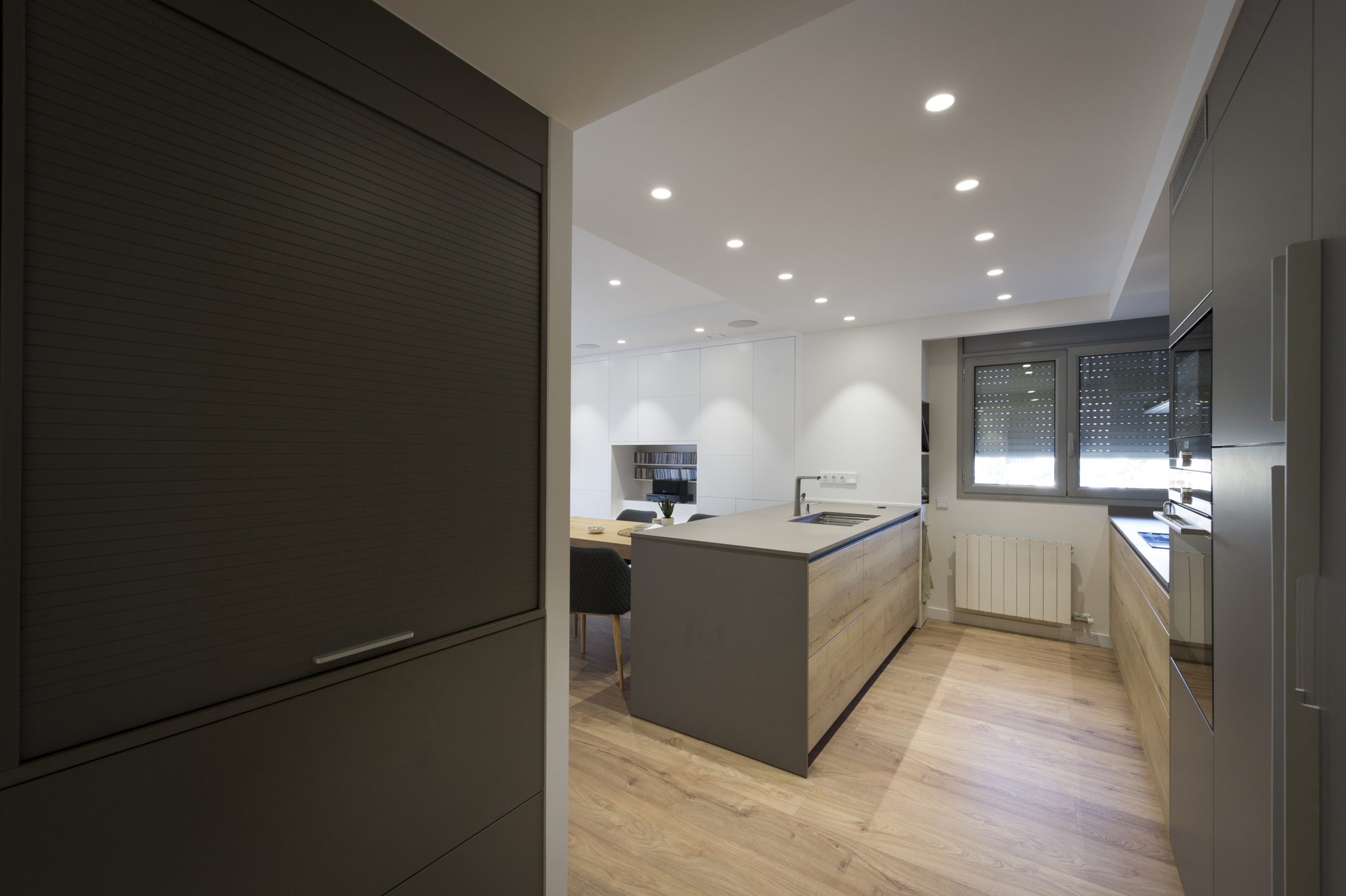 En aquest projecte hem obert la cuina al menjador i al rebedor, aconseguint més llum, amplitud, capacitat i funcionalitat. El rentador s’ha integrat dins del nucli central, que alhora permet el pas cap a les habitacions i els banys.